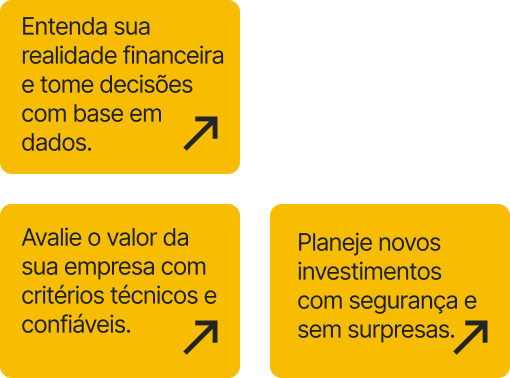 Do controle do caixa ao verdadeiro valor do seu negócio: nós organizamos, avaliamos e projetamos o futuro da sua empresa. Tomar decisões sem clareza financeira é como dirigir no escuro. Nossos serviços foram pensados para dar visibilidade, segurança e estratégia ao seu negócio